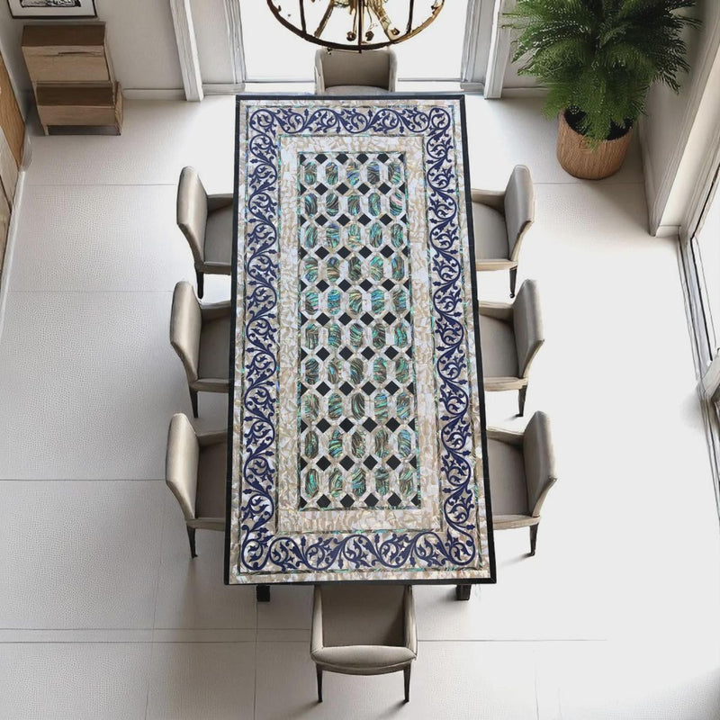 Jeweled Patterns: Tiny, hand-cut stone pieces form elaborate geometric and floral motifs, crafting a luxurious mosaic effect.